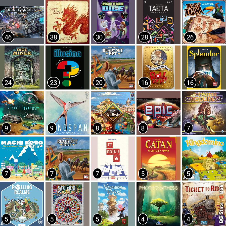 Plus here are just SOME of the games here at our house (alpha order) with a quick summary about each game (how many players, estimated time to play and complexity rating):
