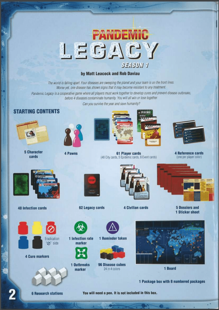 The Legacy games are a narrative story version of Pandemic that currently (July 2021) are the second most popular game of all time per Board Game Geek! It is relatively important to play through the 12 or more games in one Legacy Season with the same team of people, since the game can draw you in as a team! It seems you play 12 games in sequence, but if you fail in a game you need to play it over again (with two extra bonuses). So in the end your team may play about 18 games (more or less).