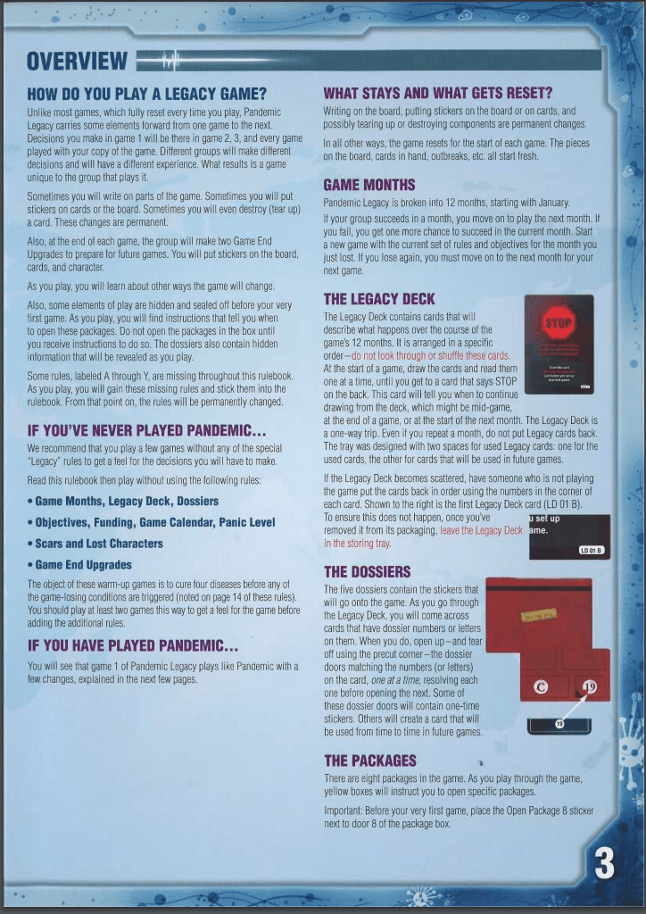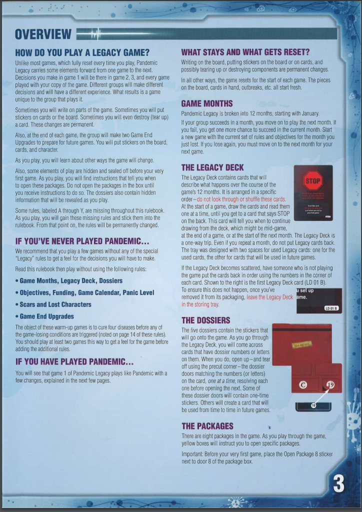 - The Legacy deck is the only thing that the base rules tell you to use. Access to the dossiers (like an Advent Calendar) and the packages is strictly limited to when specific game elements tell you to do so (usually the legacy deck, but there are a couple of exceptions – for example, Box 8 is opened if you lose four games in a row, with no in-game reminder except the sticker that you should have placed on that package).