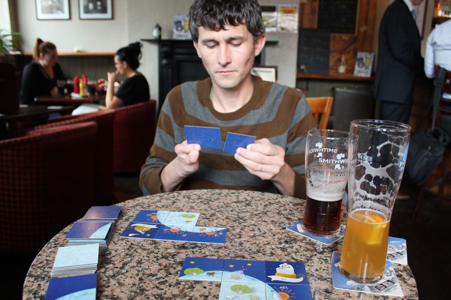 This game ties in quite well with the famous book (references at the bottom)! One of the videos said that they got the game first and then went and bought the book! We love the book, so I jumped at the chance to get a used copy of the game at I’m Board! Each player constructs a planet on a 4×4 grid so several of the videos compared it to Kingdomino (each player constructs a 5×5 land area)